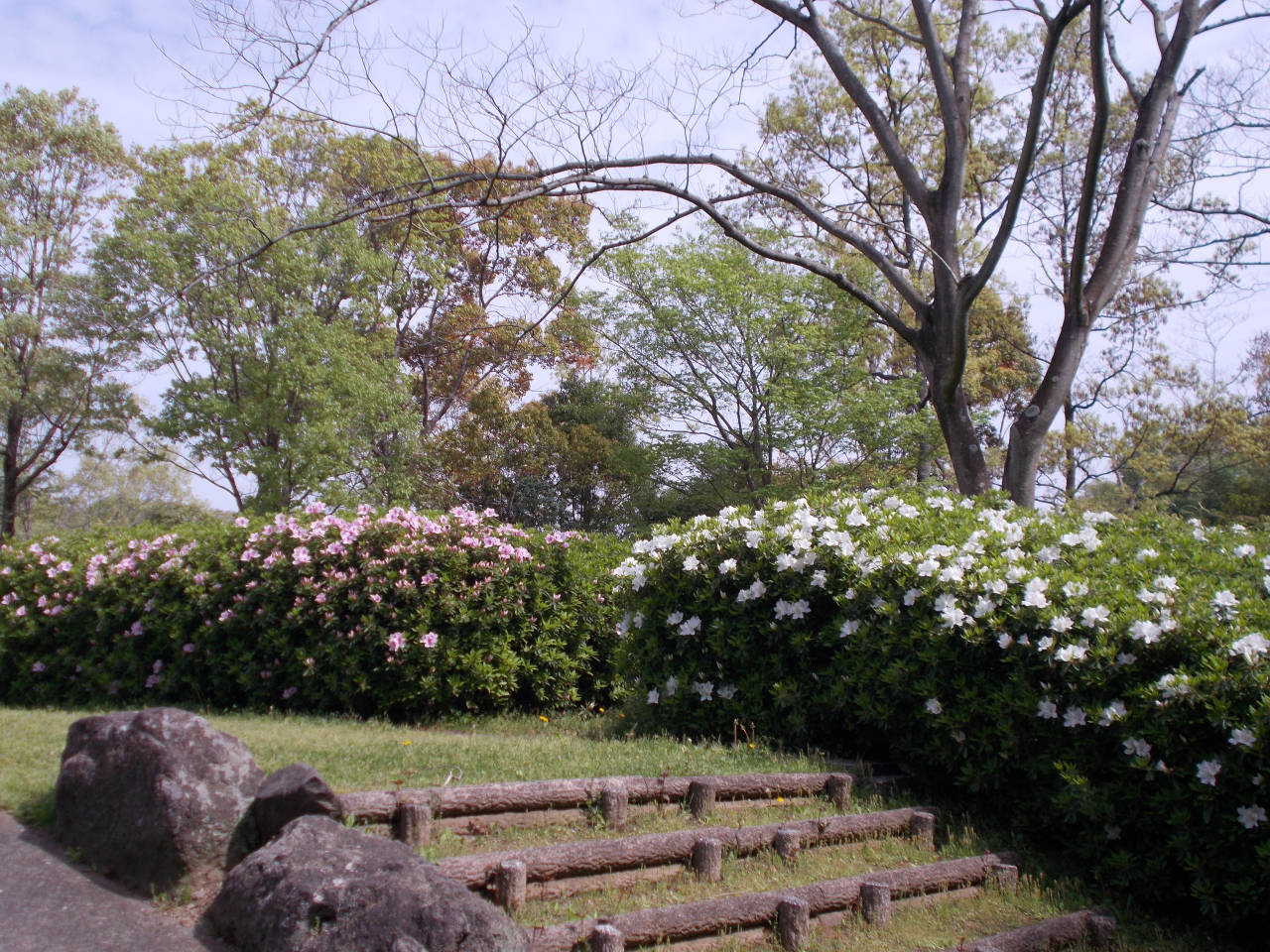 4月中旬頃、ミツバツツジ・キリシマツツジ(赤)が咲き、下旬に向けてヒラドツツジ(赤・白)・アケボノツツジ・キリシマツツジ(ピンク)が咲き始めました。